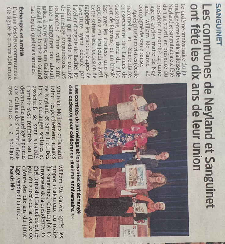 La présidente a invité le maire à prononcer quelques mots. Fabien Lainé a remercié Rachel Tomasini pour son travail accompli sans relâche. L'élu a confirmé l'intérêt de la municipalité pour cette action. Évoquant le très bon souvenir de son voyage à Neyland en avril 2014, le premier magistrat a souligné « l'accueil formidable réservé aux Sanguinetois, la parade, le lunch et son ambiance sympathique et tous les moments de convivialité ».